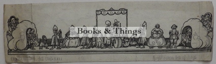 Alan Odle: Pen & ink headpiece for Candide, published 1922. 10 x 34cms (c. 4 x 13.5 inches). Titled in the artist’s hand ‘Chapter heading for chap. XXII. Right across top of page.’ The drawing appeared on page 93 of the book. Dusty, folds at both ends, small tear bottom left. Sadly there is only a small part of what looks like a fine drawing on the verso.