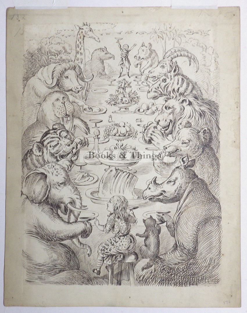 Anonymous: Pen & ink drawing of an animals’ tea-party, with an Alice type figure accompanied by a cat at the head of the table and a doll-like figure at the other. 31.5 x 24.5cms. c.1900. Some foxing. Mounted.