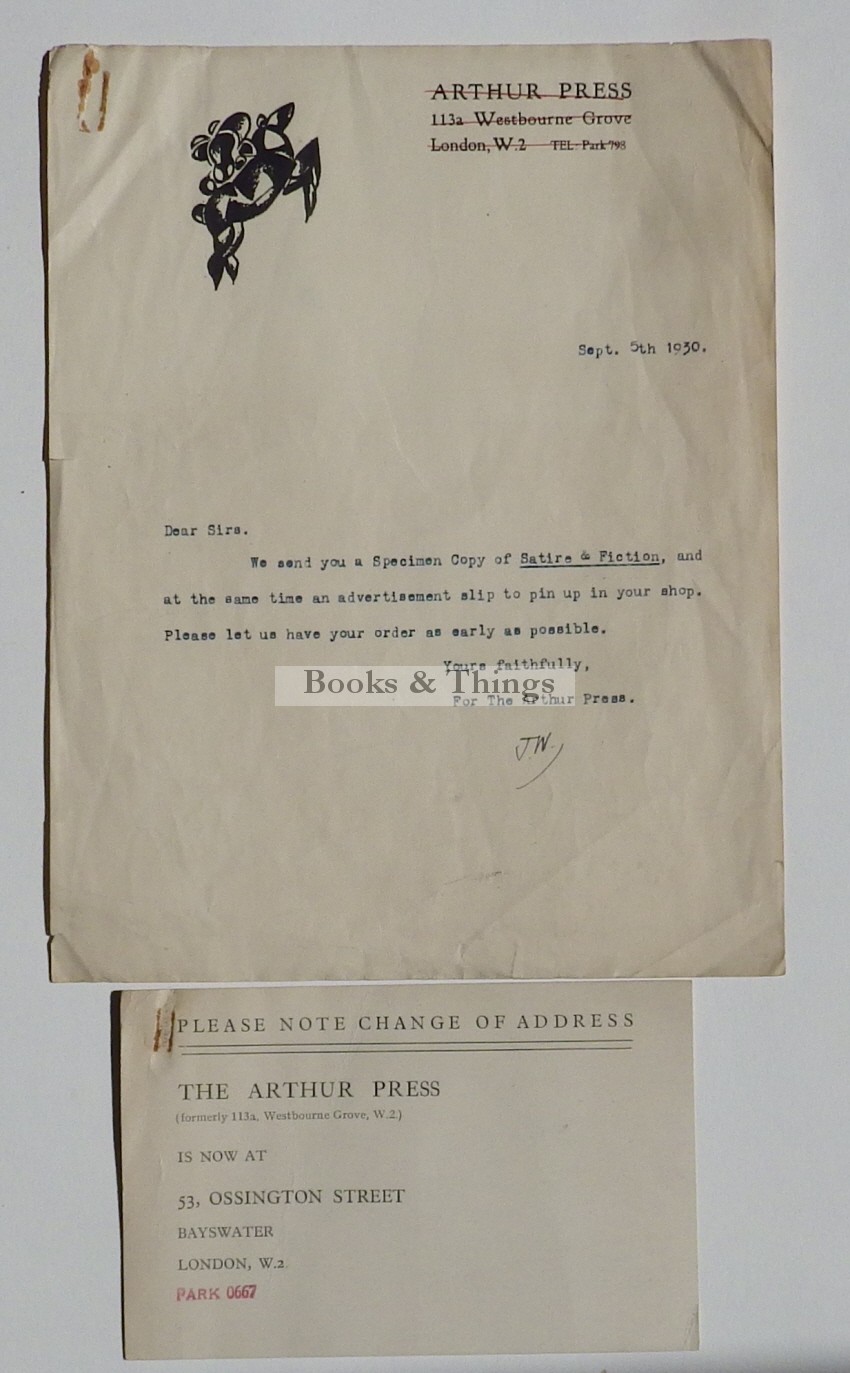 Arthur Press: Letter (1930) with Wyndham Lewis device and with a change of address card. 230 x 175mm & 90 x 140mm. Rusted staple marks.