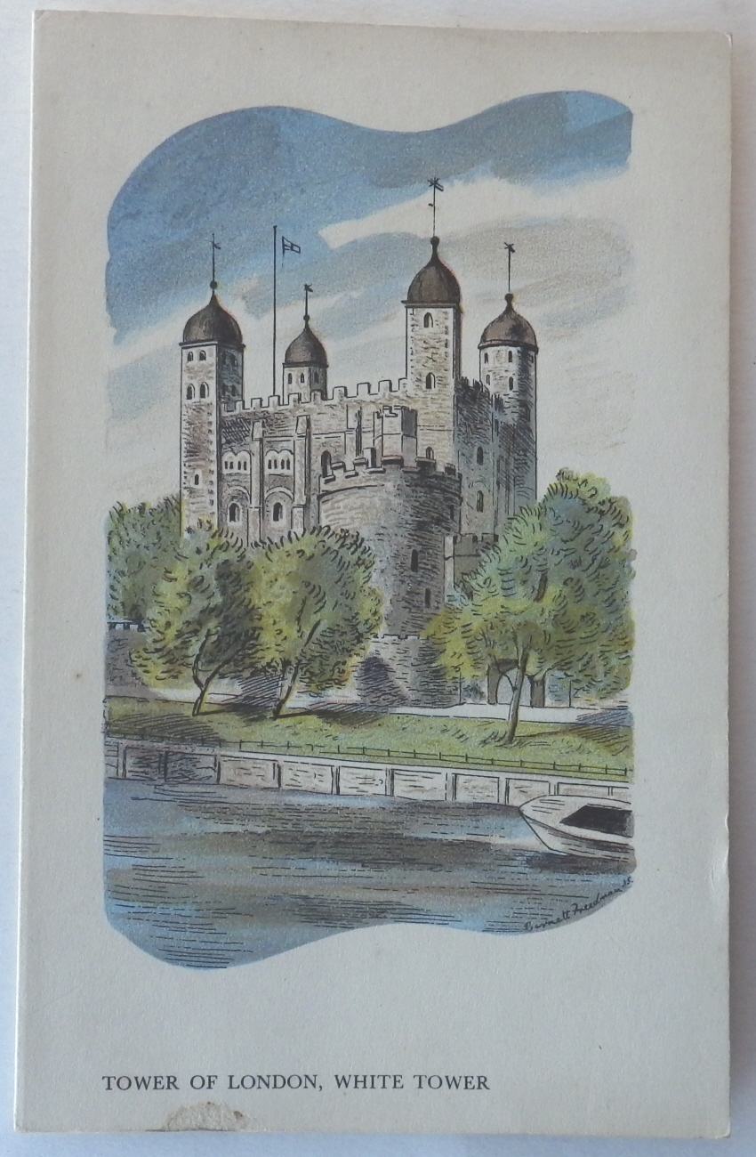 Barnett Freedman:Tower of London Orient Line menu SS Orion 1st December 1935. Colour lithograph. Folded card, 210 x 130mm. Stain on lower edge affecting all pages.