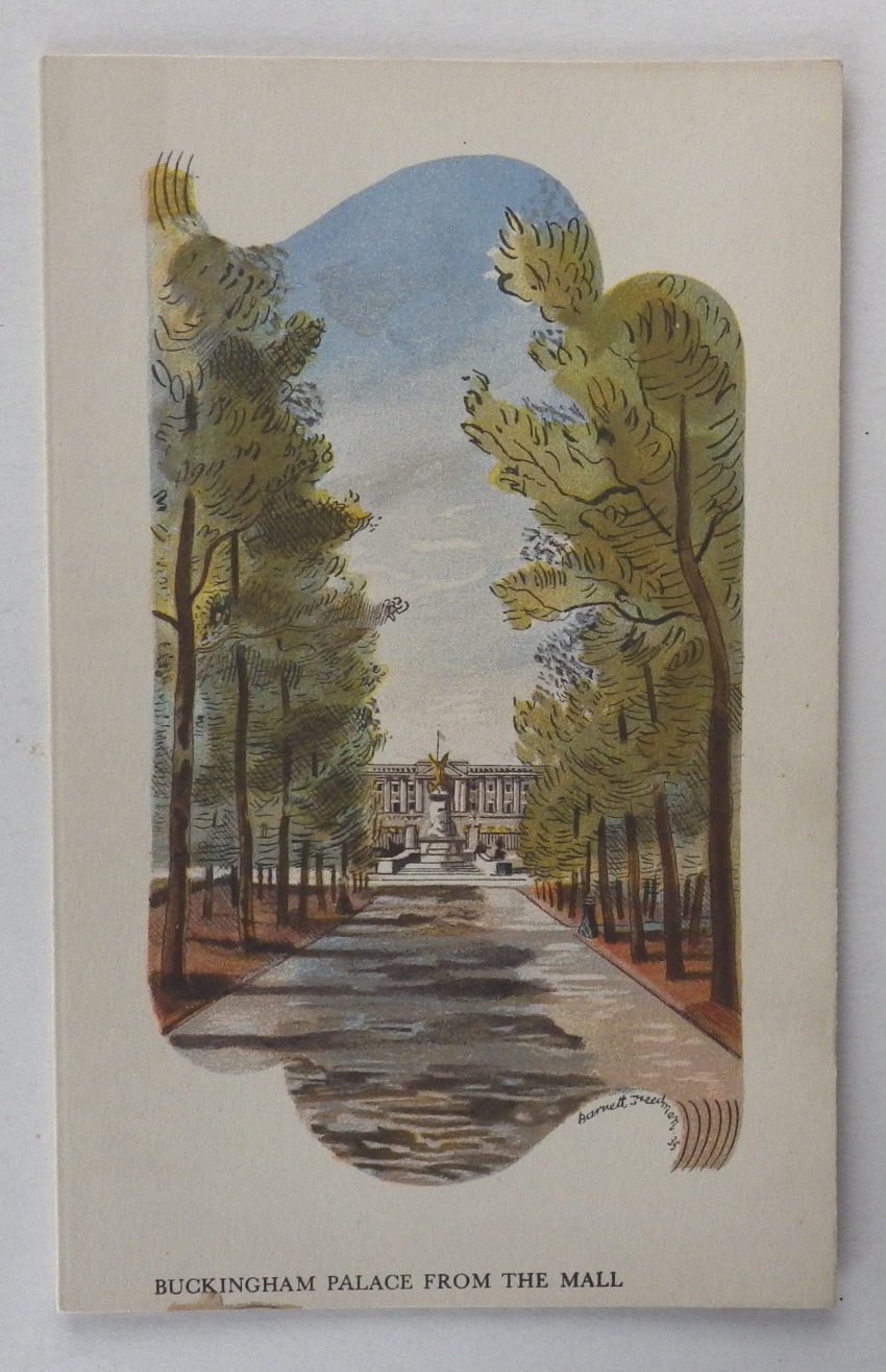 Barnett Freedman: Buckingham Palace Orient Line menu SS Orion 15th December 1935. Colour lithograph. Folded card, 210 x 130mm. Stain on lower edge on all pages.