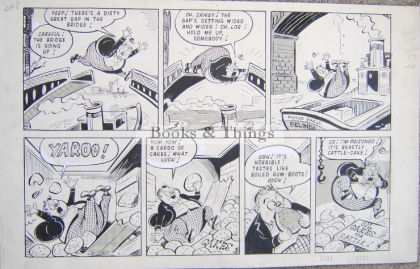 Anonymous: Billy Bunter storyboard for Knockout comic. Pen & ink. ‘Knockout 26th May’ on back. 28 x 45cms (c.12 x 17 inches). Some chinese white, mechanical tints, and a correctional overlay.