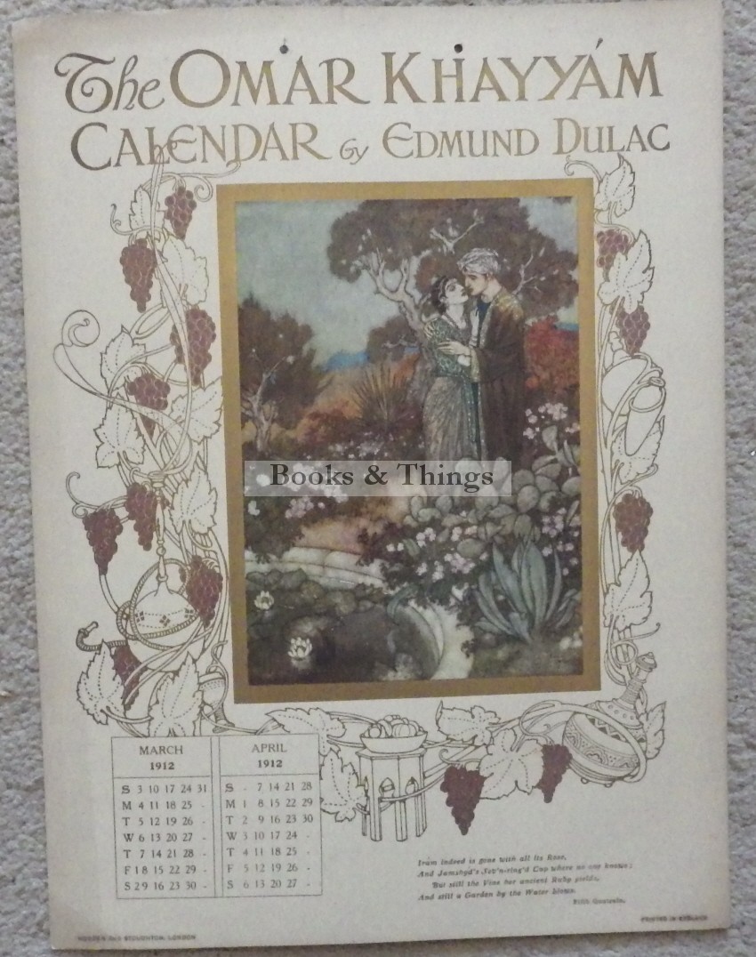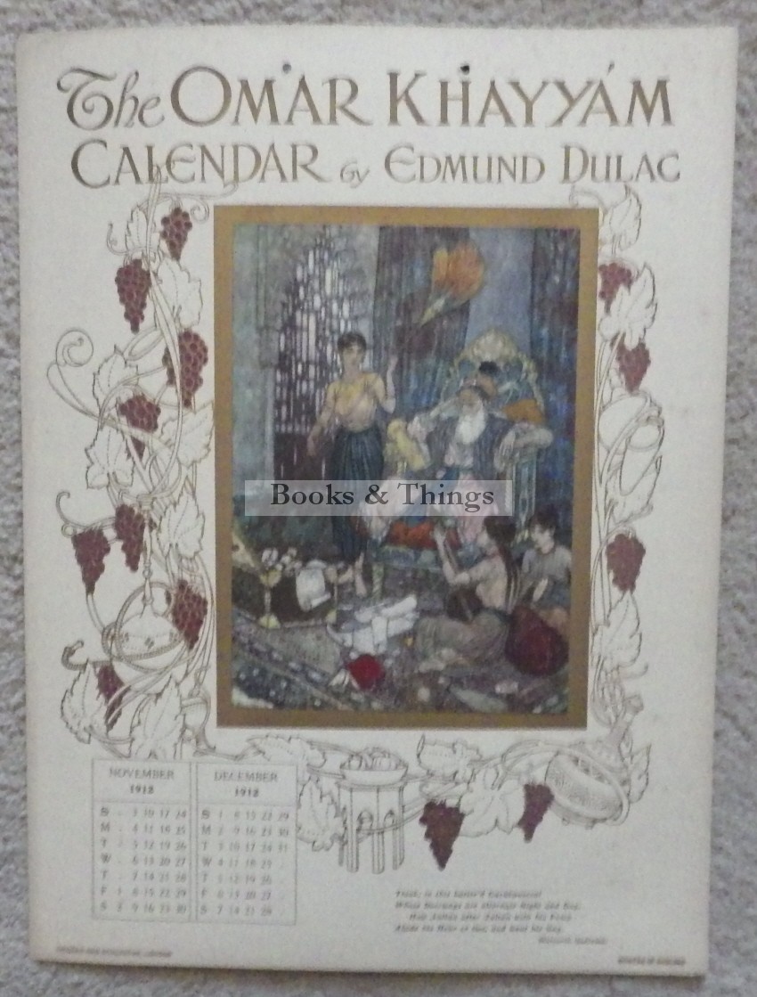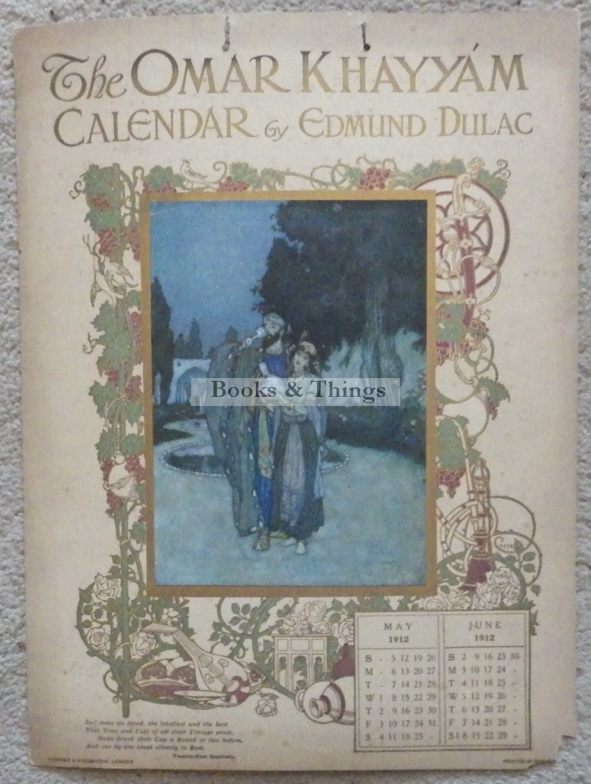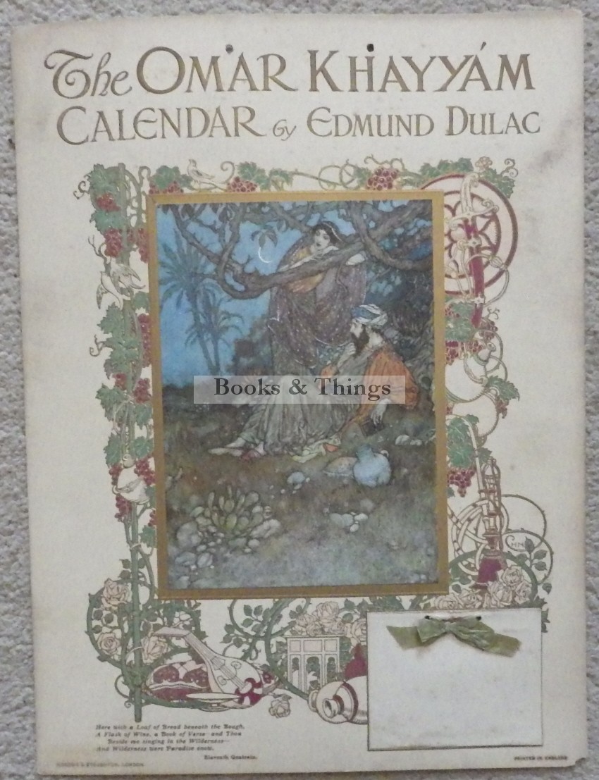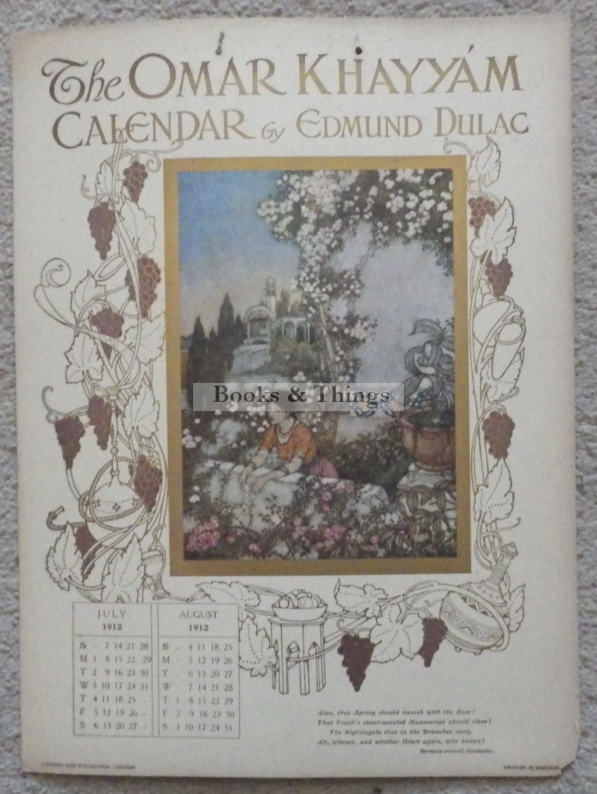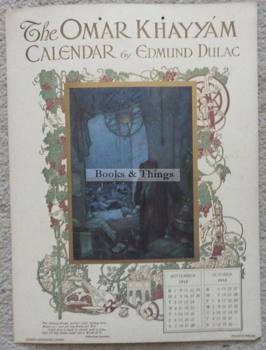 Edmund Dulac: The Omar Khyyam Calendar Hodder & Stoughton 1912. Cover & 5 plates (lacks the January & February sheet) each with a mounted colour plate. 2 decorative borders that alternate. I’m fairly sure these borders did not appear in the book editions. 36 x 27cms. Loss at lower right corner on 4 sheets, lacking the total year calendar from the front sheet, some sheets a little marked. Incomplete but a rare Dulac item.