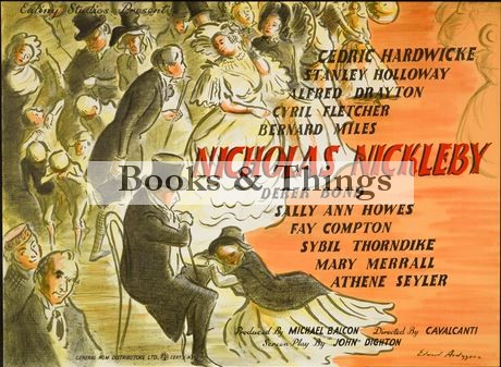 Edward Ardizzone: Nicholas Nickleby trade advert. Ealing Studios 1947. 28 x 43cms. Vertical fold and 4 small staple holes. Ardizzone did several posters for this film, in different formats and with different images, but all done in lithography. This is a line drawing with added colour. There are a few differences in the composition from the lithograph as can be seen by comparison. Strangely too there is more detail at the top of the poster but less at the bottom than the lithograph. There are 2 colour drawings on the verso.A rare item.
