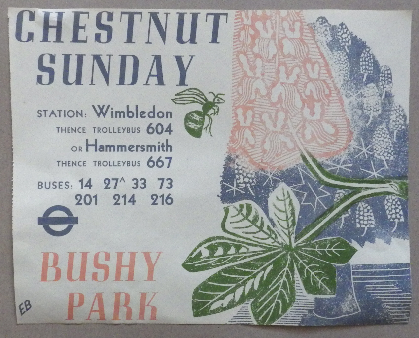 Edward Bawden: Chestnut Sunday – Bushy Park. London Transport 1936. Colour lithograph, vertical fold. 248 x 312mm. Printed at the Curwen Press and issued by LT in 1936, this is the one issued in the July 1936 issue of Signature, also printed by the Curwen Press.