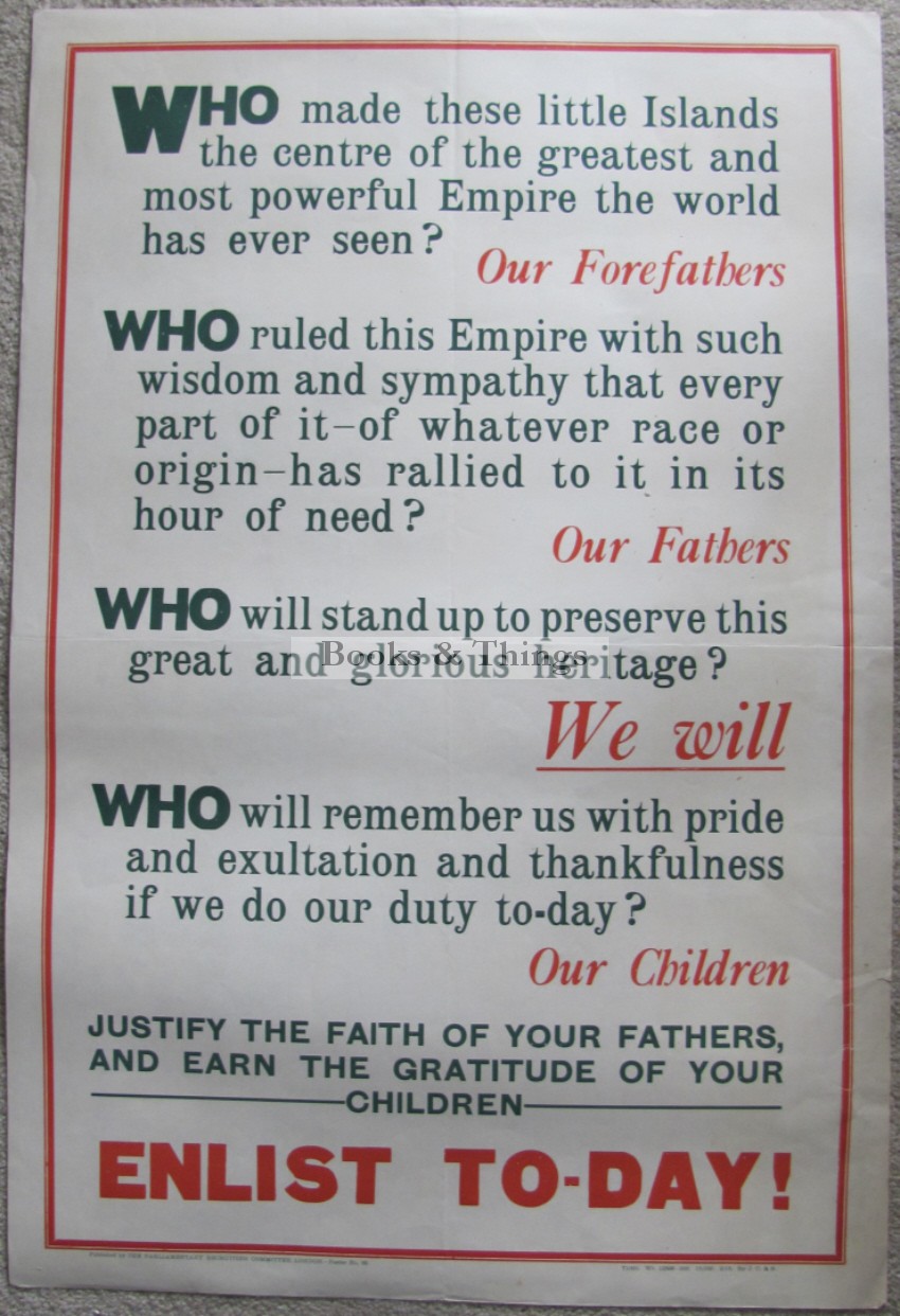 Anonymous: WW1 Recruiting poster Enlist Today! Parliamentary Recruiting Committee poster 68. 1915. 76 x 51cm ( 30 x 20 inches). Folds.