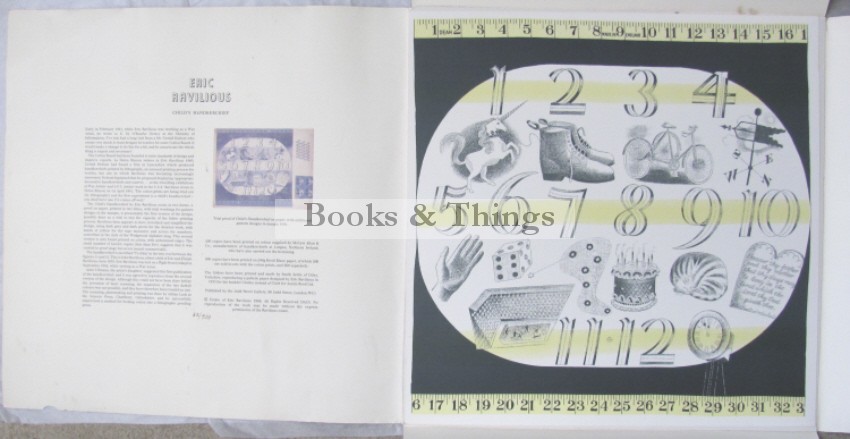 Eric Ravilious: Child’s Handkerchief colour lithograph & linen handkerchief with same design. 450 x 450mm. This design was similar in concept to his child’s alphabet set of ceramics, but was to be produced as a handkerchief. However he died before it came to fruition. His family commissioned the lithograph to be printed in 1989 by the Judd Gallery in an edition of 500 copies, 200 of which were accompanied by the design printed on linen as well. This is no. 113 of the 200 copies. Both items contained in a printed folder.