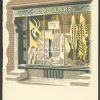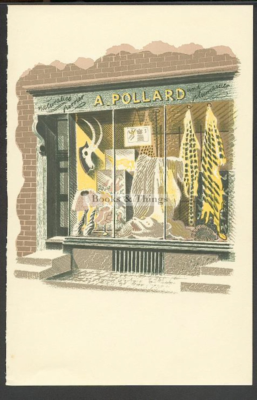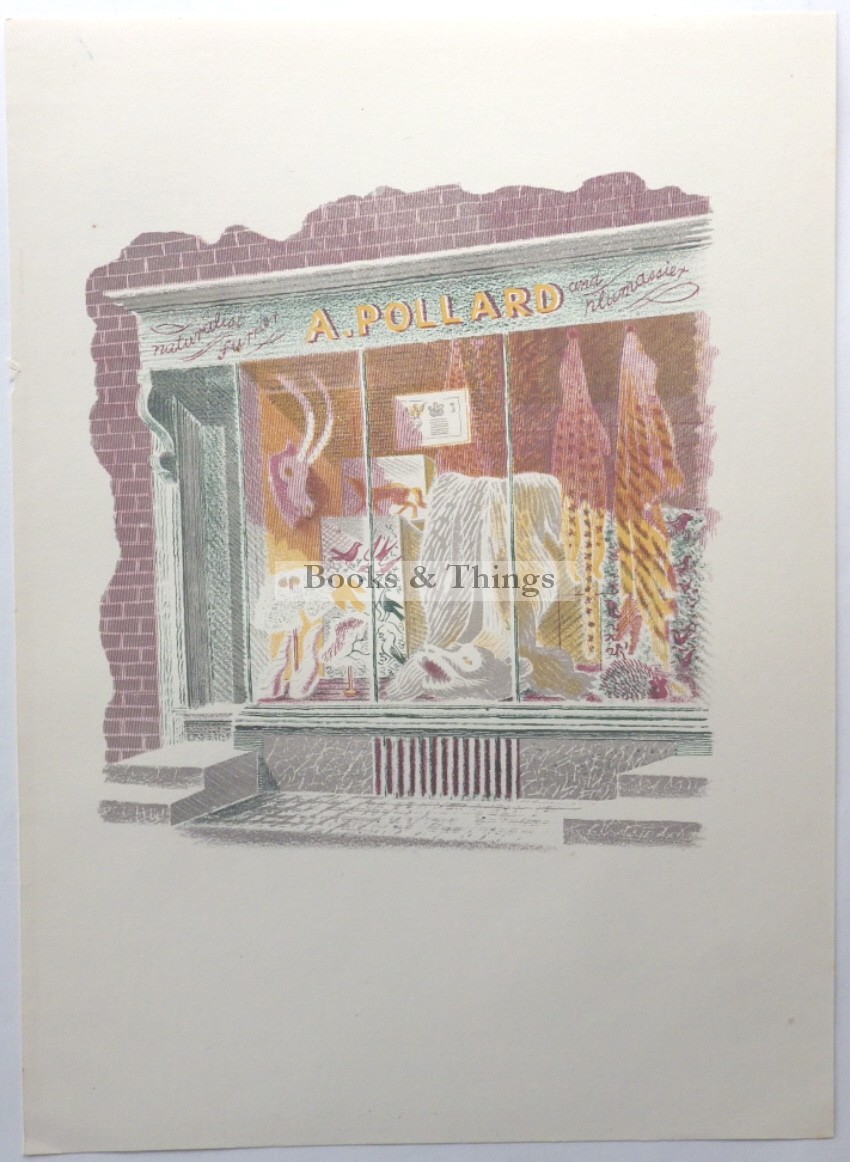Eric Ravilious: A. Pollard furrier. Colour lithograph. Preliminary design for High Street, 1937. 245 x 180mm. Ravilious first 3 experiments for High Street were published in Signature in March 1937. As can be seen from the published image of the 1938 High Street plate attached, the design underwent some marked colour changes, both in the the shop window & the doorway, and a black element has been added to the signboard. There has also been some additional work on the top edge of the design. This print benefits from the larger page format of Signature, giving it the wide margins that are lacking in the book prints. As less of these prints were issued than the book ones, they are scarcer too.