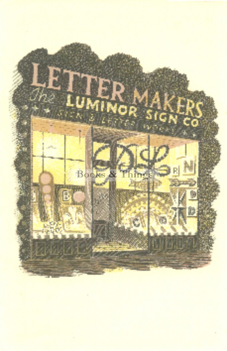 Eric Ravilious: Letter Makers. Colour lithograph. Preliminary design for High Street, 1937. 245 x 180mm. Ravilious first 3 experiments for High Street were published in Signature in March 1937. As can be seen from the published image of the 1938 High Street plate attached, the design underwent some marked colour changes, both in the the shop window & surrounding area, including the removal of the radiating lines in front of the step. This print benefits from Signature’s larger page format, giving it the wide margins that are lacking in the book prints. As less of these prints were issued than the book ones, they are scarcer too.