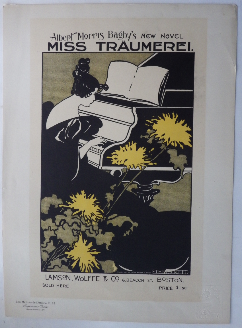 Ethel Reed: Miss Traumeri. Maitres de L’Affiche plate 99, issued Paris December 1897. 40 x 28.5cms (15.75 x 11.25 inches). Embossed Maitres de l’affiche stamp in lower right corner, 5mm tear left margin.