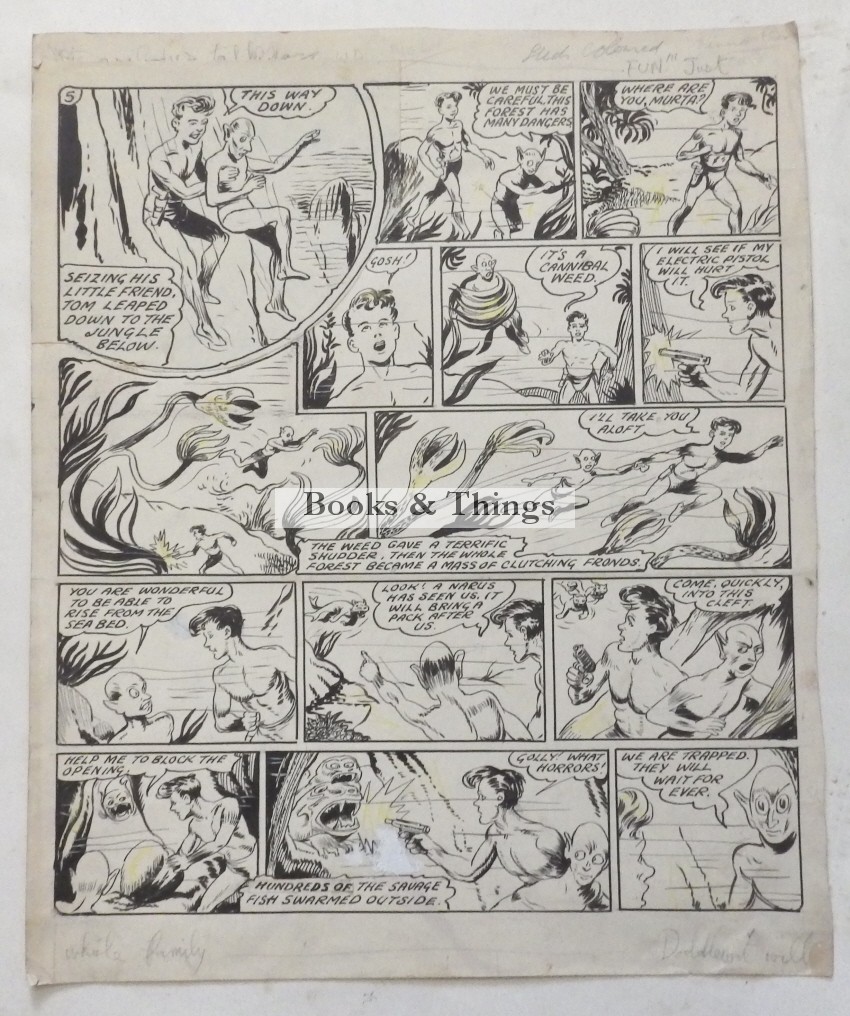Anonymous: Pen and ink storyboard, probably for one of the Gerald G. Swan ‘FUN’ publications in the 1940’s. 39 x 32.5cms. Creases, some yellow crayon marks which I don’t think are by the artist, and some chinese white. The first illustration is an overlay, interestingly replacing an illustration with the title Lord of the Under-Seas, which can be seen by holding up to a strong light. There is also a lettering overlay on the bottom central image.