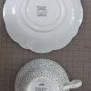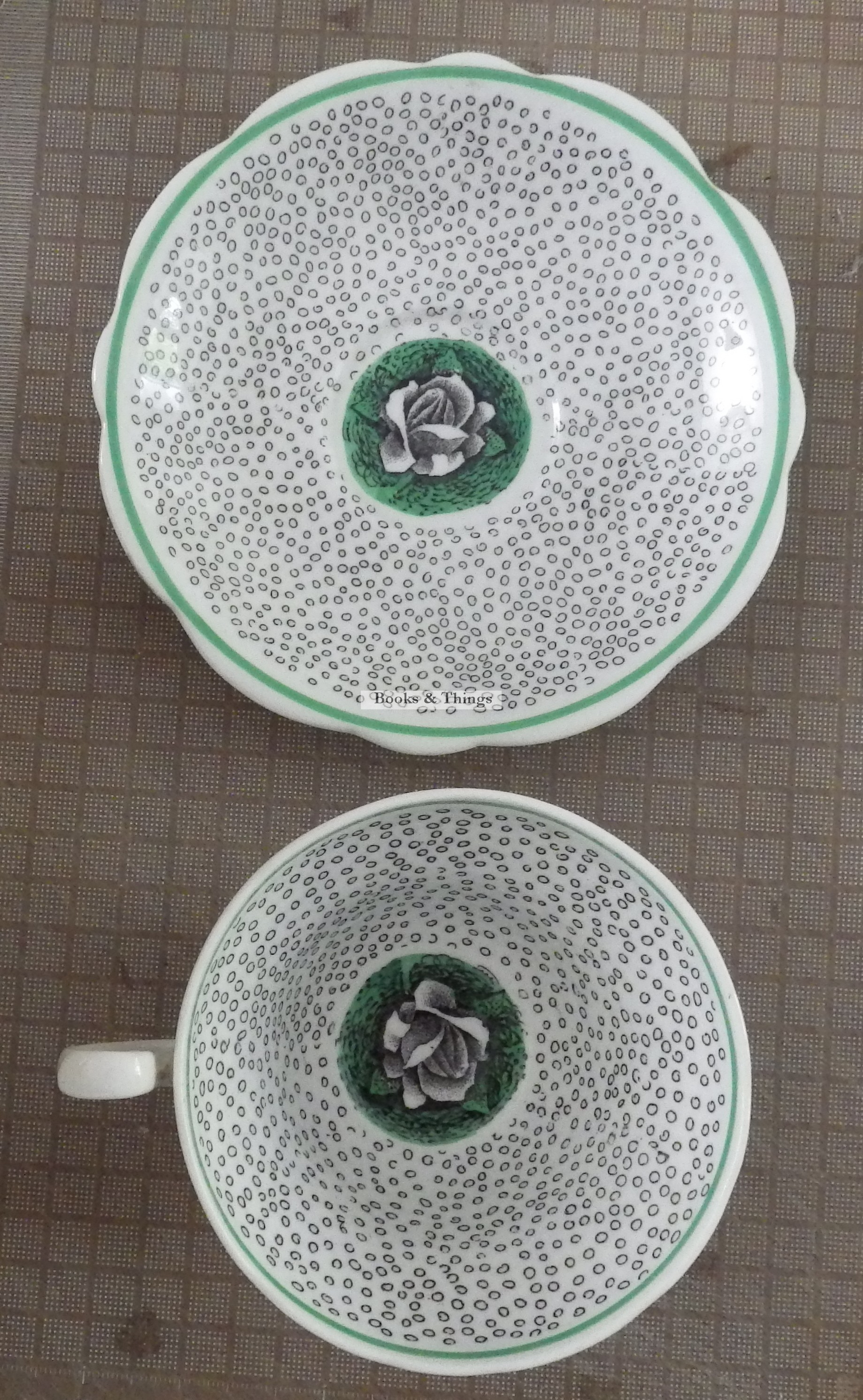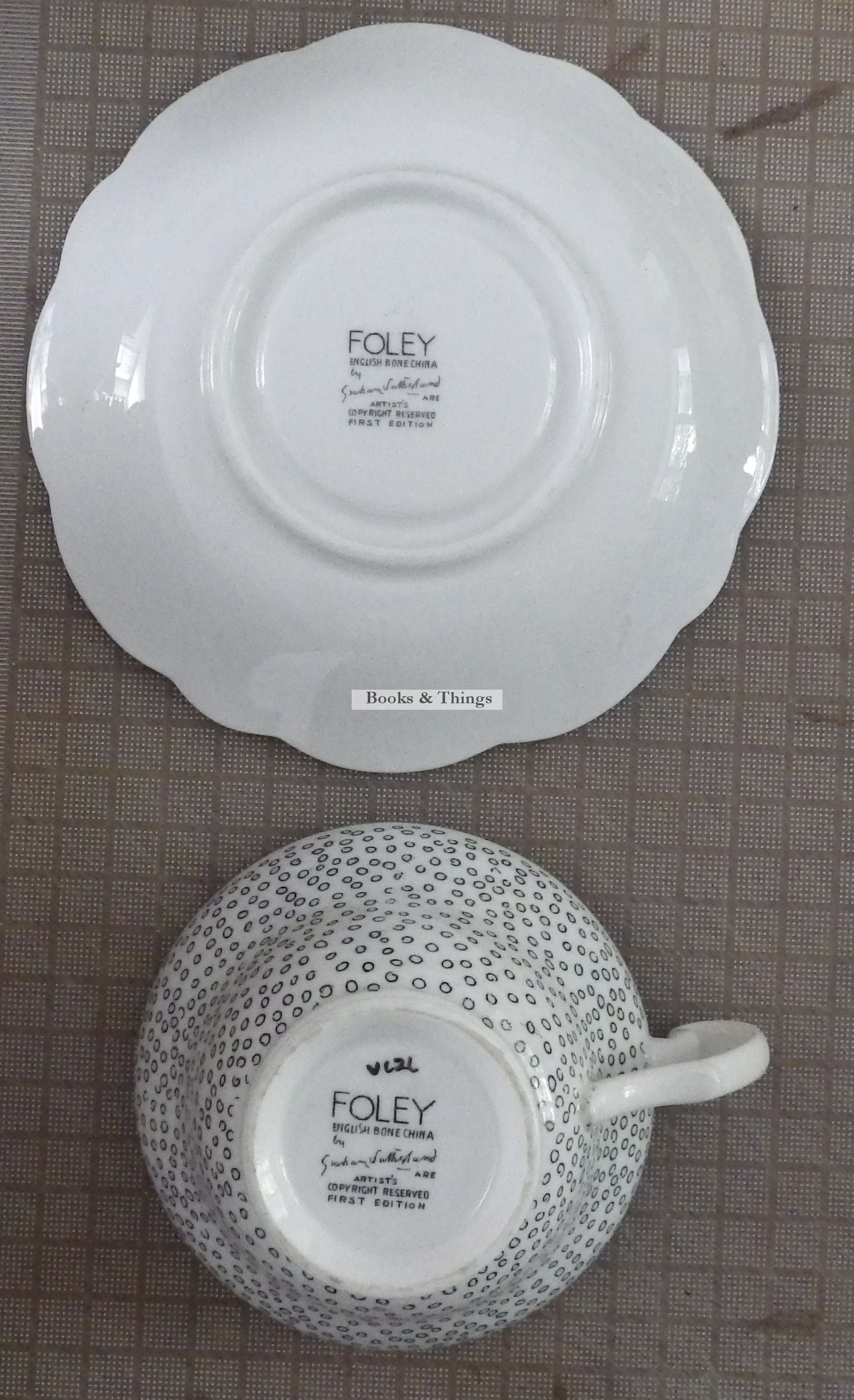 Graham Sutherland: Cup & Saucer in green rose pattern by Foley for the Harrods Exhibition 1934. Cup 10cms diameter & 5cms high. Saucer 14.5cms diameter. I believe only 12 services were produced for each of the many designs by different artists in the exhibition, and those were marked FIRST EDITION, as here. Some of the designs were issued later but without FIRST EDITION on them.