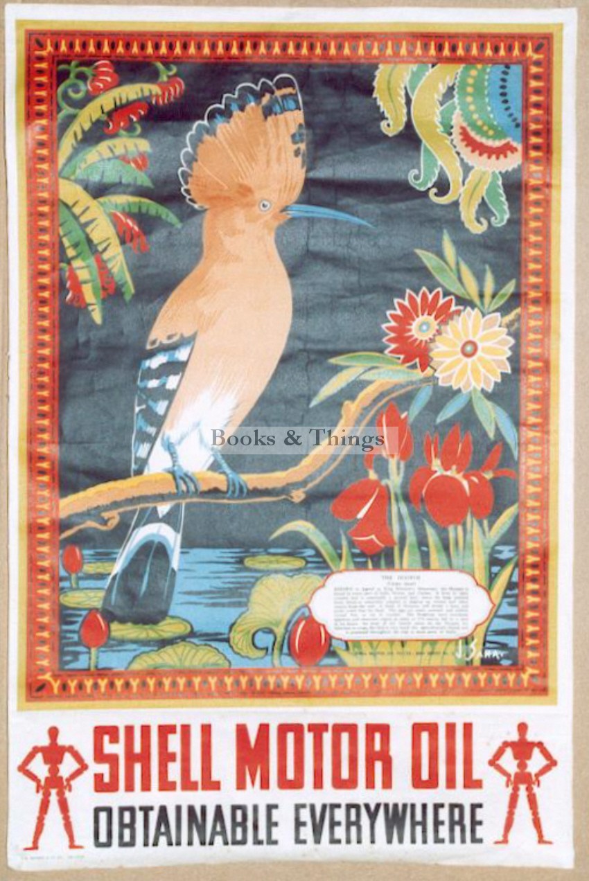 J. Saha: The Hoopoe – Shell Motor Oil poster. 76 x 51cms (30 x 20 inches). Printed in Calcutta. Few creases. The panel at the bottom is stuck on. The stick men were designed by McKnight Kauffer.