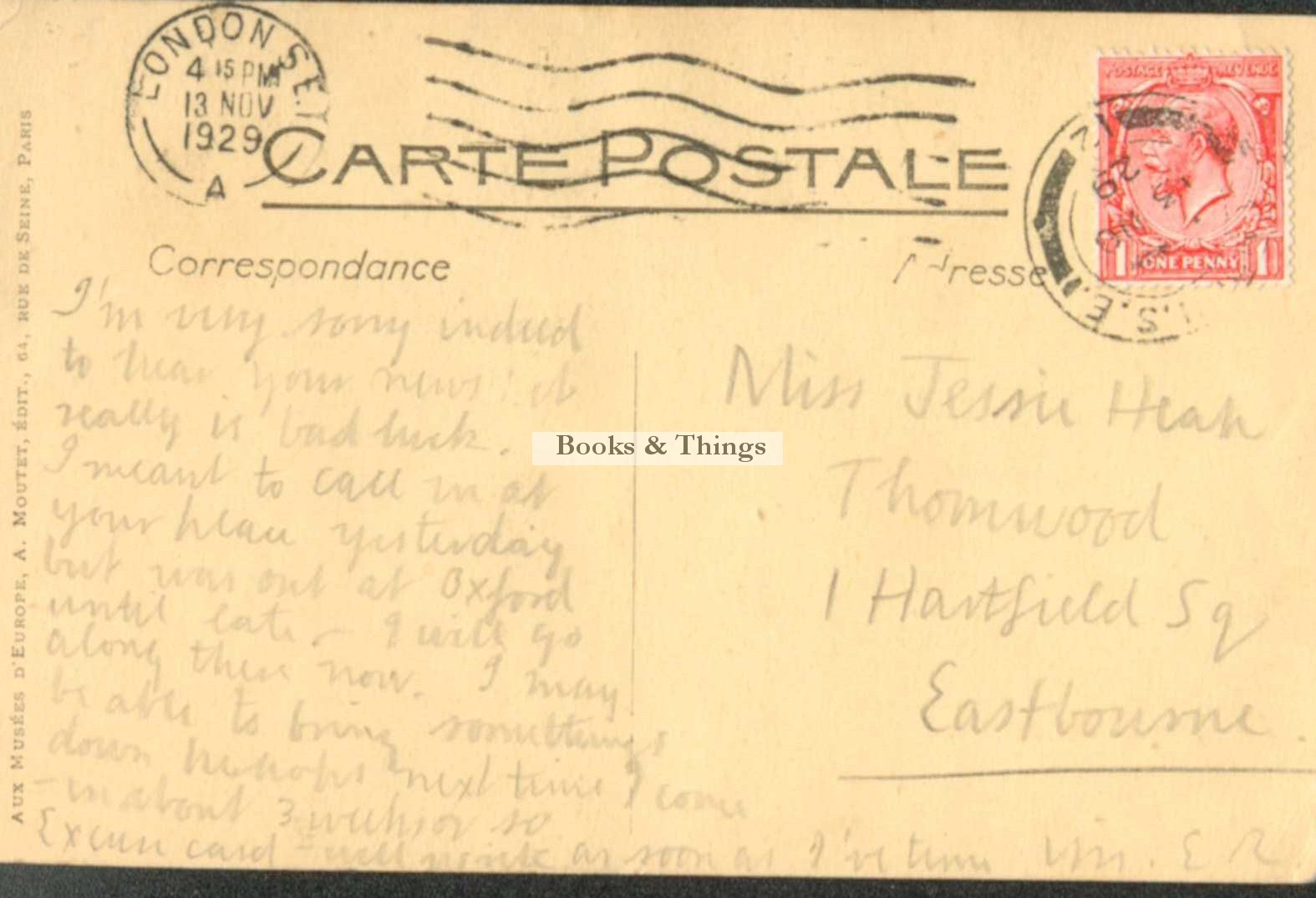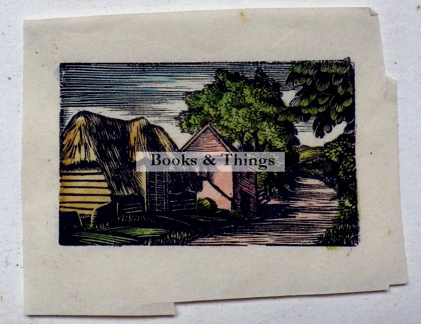 Jessie Heap: Hand-coloured woodengraving. 2 x 5 cms (image). Jessie Heap was a pupil (possibly more) of Eric Ravilious at Eastbourne College of Art in the late 1920’s, and her work shows his influence. Also shown is a postcard from Ravilious to Heap that I once had which came with this woodengraving.