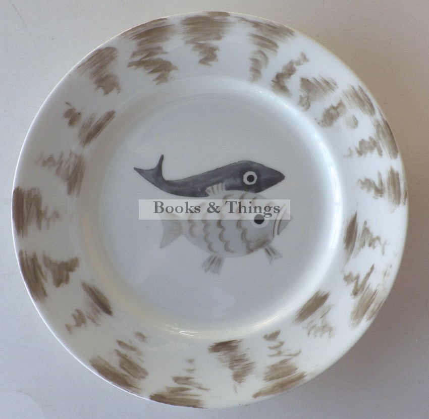 John Armstrong: Fishes plate for Foley c.1934. 18cms diameter. This was designed for the Harrod’s Exhibition of 1934, featuring ceramics by a host of Modern British artists.  I believe there were only 12  services of each design produced for the exhibition. Those are marked ‘FIRST EDITION’. Although the exhibition was not a great success, the most popular services were issued commercially, but without the ‘FIRST EDITION’ mark. This is one of those issued commercially, but still a rare item.