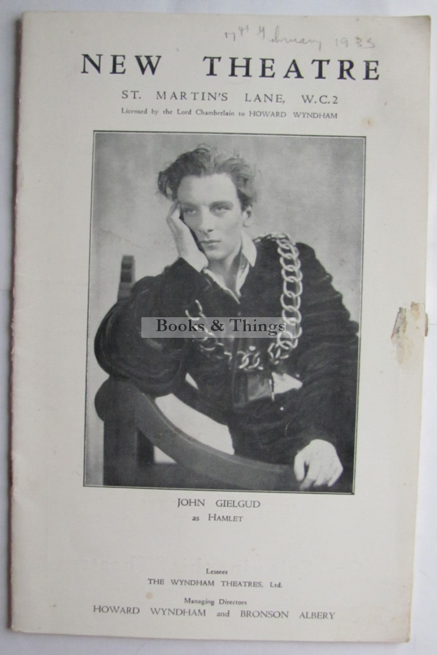 John Gielgud: Hamlet theatre programme. 3 photo plates. 20 pages, 210 x 135mm; pictorial wrappers (date 17th February 1935 written in pencil on upper cover). New Theatre 1935. This famous production, directed by Gielgud, opened in 1934. Cast includes Jack Hawkins, Jessica Tandy, & Alec Guinness as a bit player.