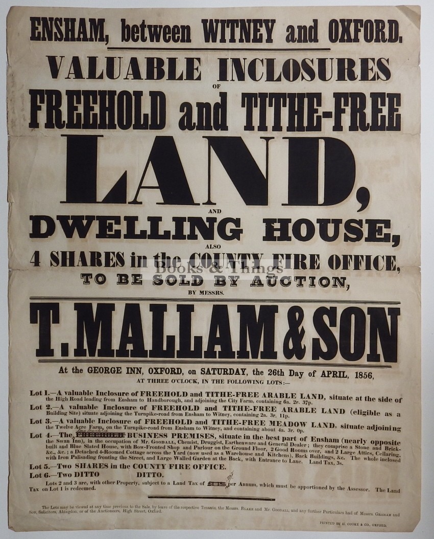 Ensham (Eynsham): Land & dwelling house. Mallam’s auction 26th April 1856. Folds & creases. 44.5 x 57cms.