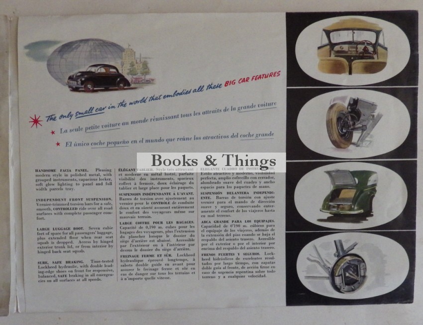 Morris Minor: Announcement brochure. 180 x 250mm (folded). Nuffield Exports 1948. Birth of a classic.The Morris Minor was introduced at the Motor Show in September 1948. This concertina brochure was issued at that time (printer’s code is given as 9/48). Details are given in English, French & Spanish. A rare survivor.