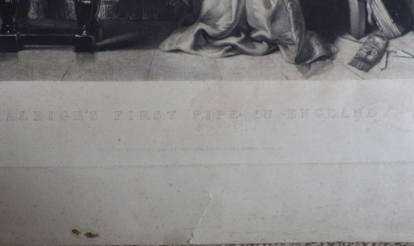 W. R. Buss: Raleigh’s first pipe in England. Steel engraving, engraved by James Egan. 49 x 63cms. Tilt & Bogue February 1st 1841. Marginal tears, staining, foxing. Marked ‘PROOF’.