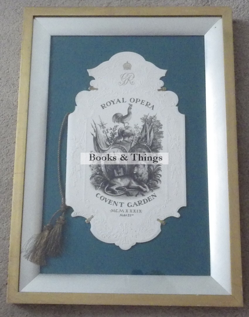 Rex Whistler: Royal Opera House programme. 2 cover illustrations & 14 vignettes (4 repeats); 8 pages, 395 x 230mm; embossed shaped covers with gold coloured tassle; framed & glazed with programme held in place by sprigs (slight photo reflection at bottom of the image). Sprigs on back, so easily removable. Royal Opera House 1939. This wonderful shaped item was issued for the visit of the French president.