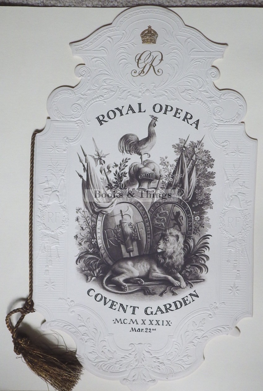 WHISTLER, Rex: Royal Opera House programme. 2 cover illustrations & 14 vignettes (4 repeats); 8 pages, 395 x 230mm; embossed shaped covers with gold coloured tassel (small piece of front cover missing on bottom edge). Royal Opera House, Covent Garden 1939. This wonderful shaped item was issued for the visit of the French president.