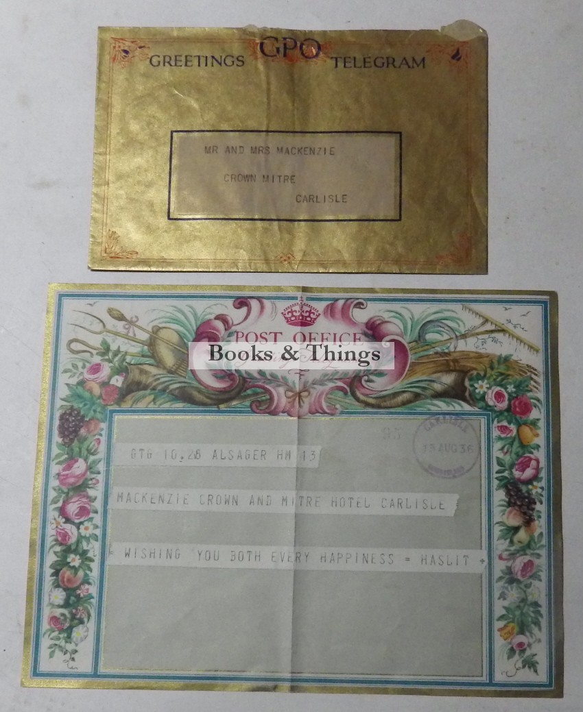 Rex Whistler: Greetings telegram Post Office 1936. Colour border design; 170 x 220mm; vertical fold, envelope; used.
