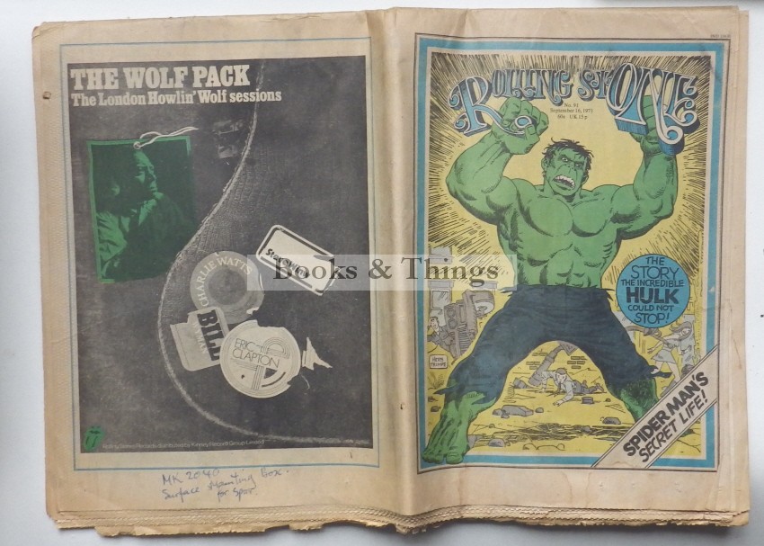 Rolling Stone: no.91 Sept 16th 1971. Marvel Comics feature, Muddy Waters article by Pete Guralnick etc. 43 x 30cms, horizontal fold, ink note on back page, generally aged.