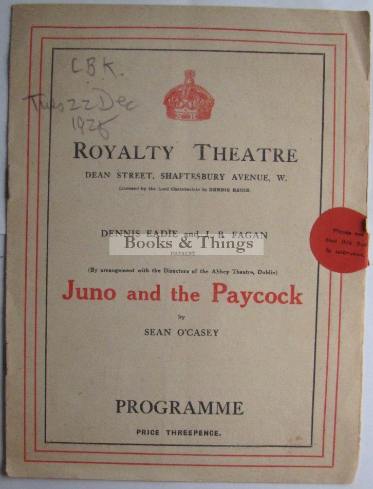 Sean O’Casey: Juno & Paycock theatre programme; 4 pages, 235 x 175mm; printed wrappers (short tear in rear edge). Royalty Theatre, pencil date 22nd December 1925.