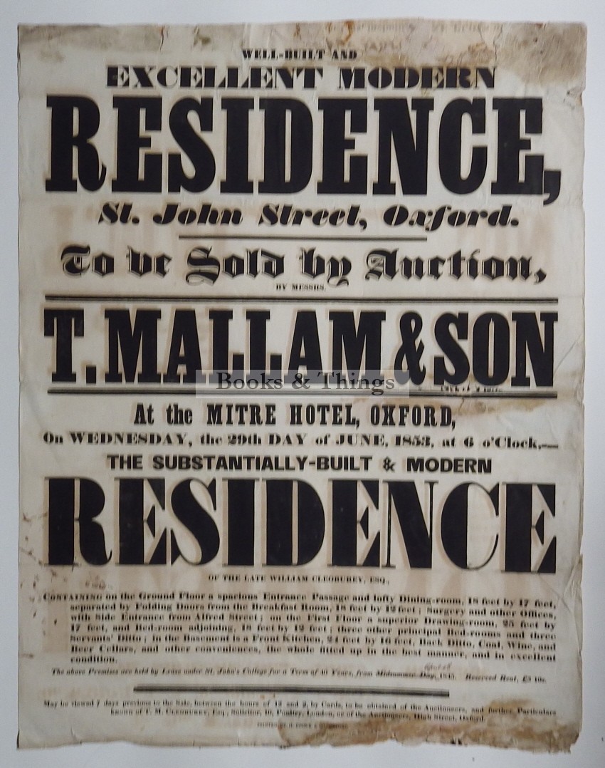 St John St, Oxford: Mallam’s auction on 29th June, 1853. 57 x 45cms. Creases, archivally repaired tears, some dampstaining which has been crudely re-enforced with paper on the back. Probably 22 St John St, as this was the residence of William Cleoburey, a well-known Oxford surgeon, who died earlier that year.