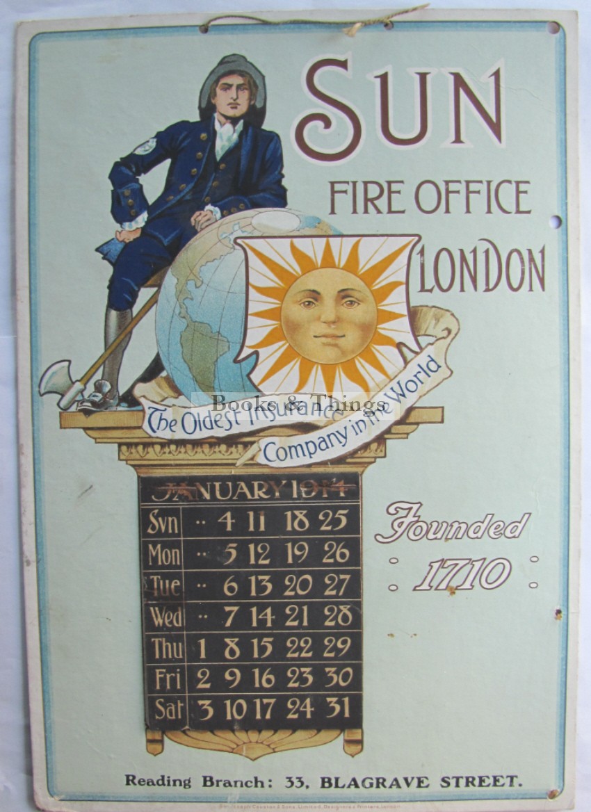 Sun Insurance: calendar 1914. 4 puncture holes on right hand side. The calendar is missing December, although there is no sign of it having been removed. 335 x 230mm.