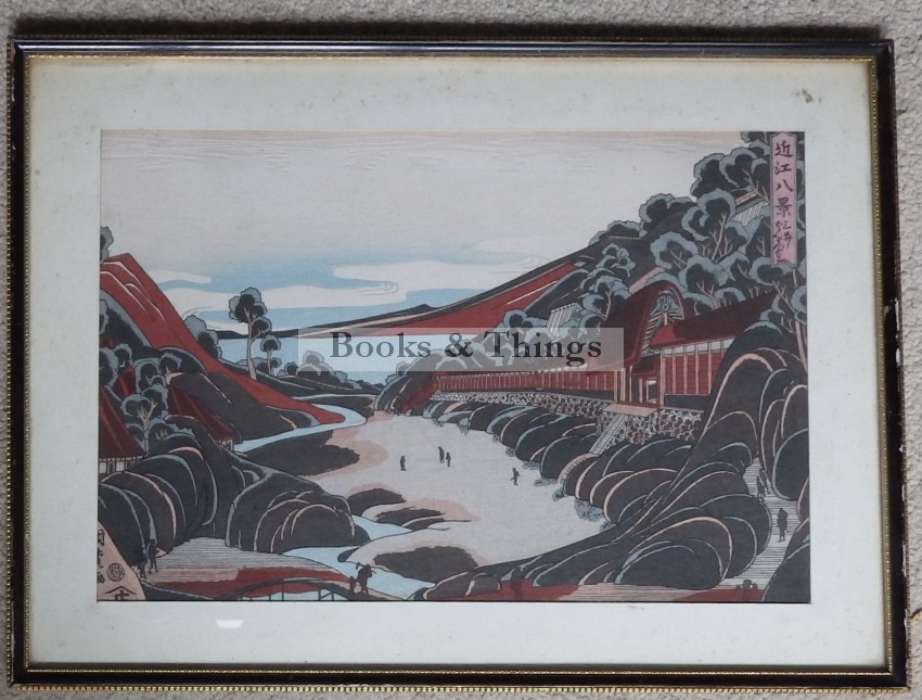 Utagawa Kunitora: Colour woodcut, stuck to board. Framed. 33 x 46cms (frame). 20th century. Label in Japanese on the back. Some chips to the frame.