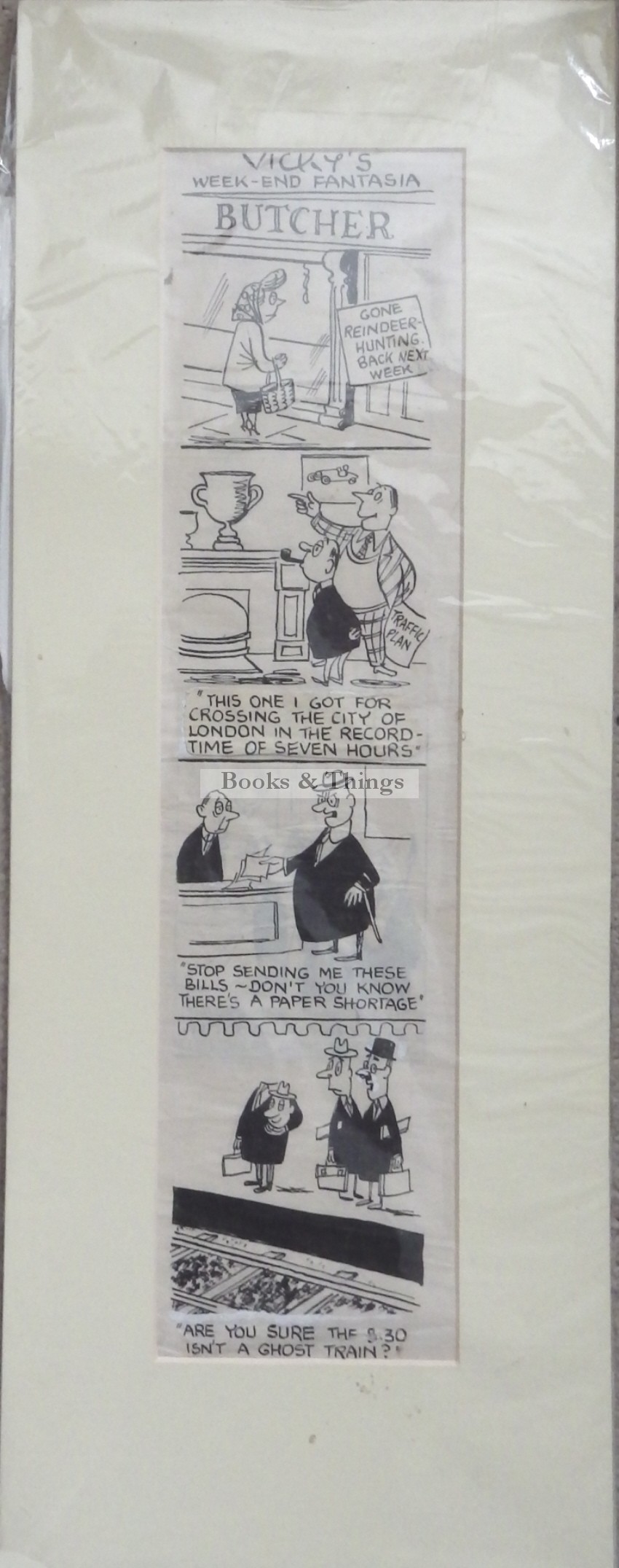 Vicky (Victor Weisz): Cartoon for The News Chronicle c. 1948. 4 cartoons in pen entitled ‘Vicky’s Week-end Fantasia’. 440 x 100mm in mount 600 x 230mm.