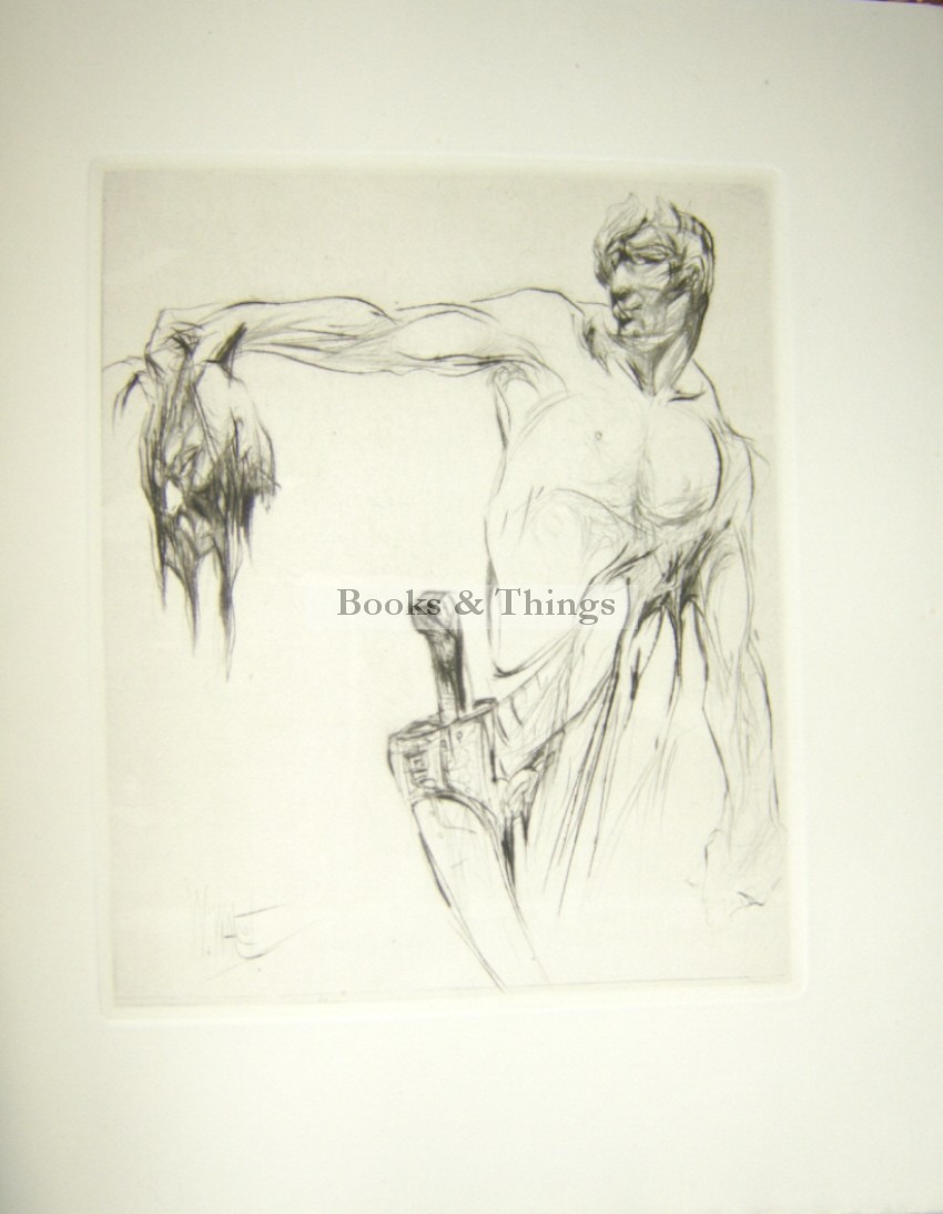 William Walcot: Herodias by G.Flaubert; 7 hors texte, 4 chapter headings & cul de lampe etched plates; 55 pages, 315 x 255mm; loose in original wrappers, leather-backed portfolio (a little rubbed), slipcase; no.98 of 125 copies on Velin d’Arches from an edition of 221 copies. Devambez, Paris 1928. Note: the list of plates would indicate another hors texte plate, but it only lists 3 extra plates for the edition of 25, rather than the 4 called for in the colophon, so this is an error in the list of plates, rather than a missing plate. This has been checked against 2 other copies.